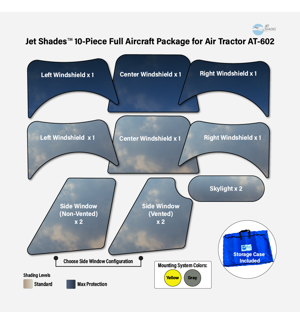 Because sun intensity changes dramatically over the course of a long flying day, this full-aircraft package includes both Standard and Max Protection windshield Jet Shades — giving you the flexibility to switch between lighter and darker shading as conditions shift.