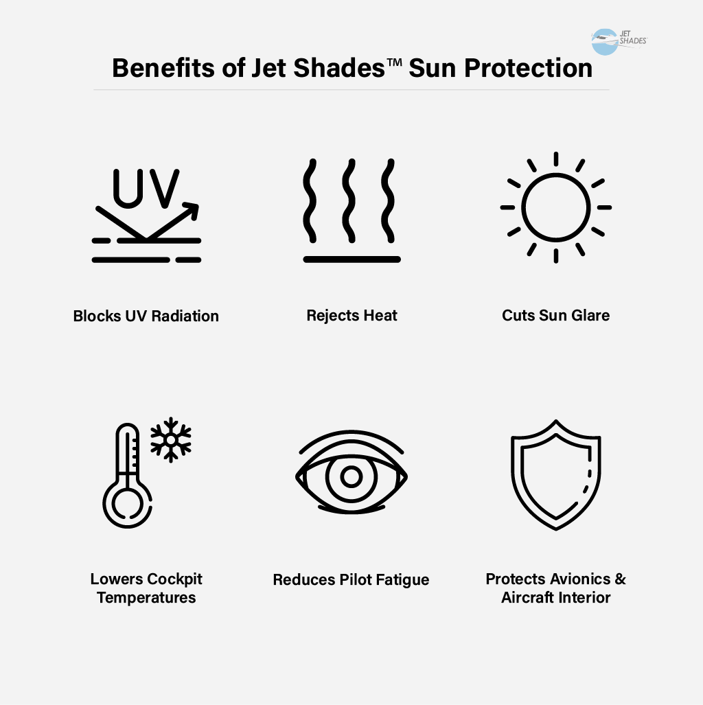 Jet Shades are thoughtfully designed with pilot and passenger comfort in mind. While other sun protection products focus mainly on blocking visible light, Jet Shades are built so you can enjoy complete protection without blocking your view, including: