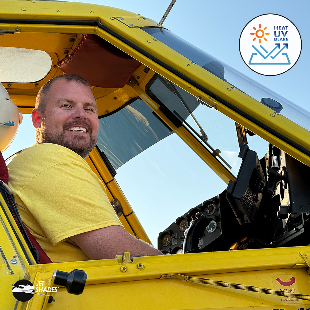 If you fly an Air Tractor, you know low-altitude work often means intense sun exposure—overhead on the ramp, blinding in turns, and draining over long duty days. Jet Shades manage heat, glare, and UV exposure across the primary forward visibility areas, helping pilots maintain focus and endurance throughout the workday. Made from optical-quality materials, Jet Shades manage intense sun exposure so you can: